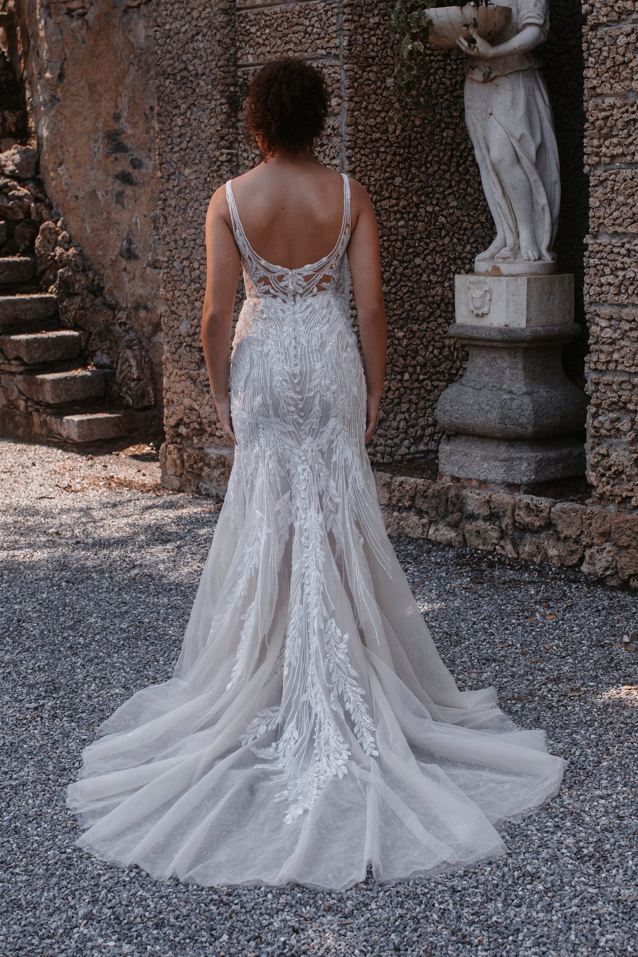 Sparkle tulle, embellished with beaded, sequined lace, adorns Venus’s subtle fit-and-flare sheath silhouette.