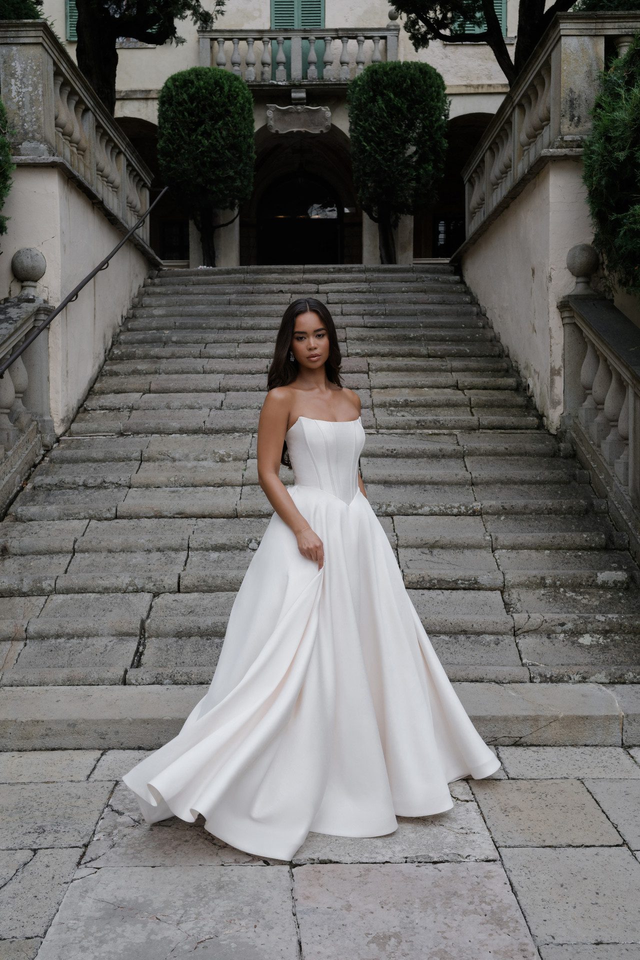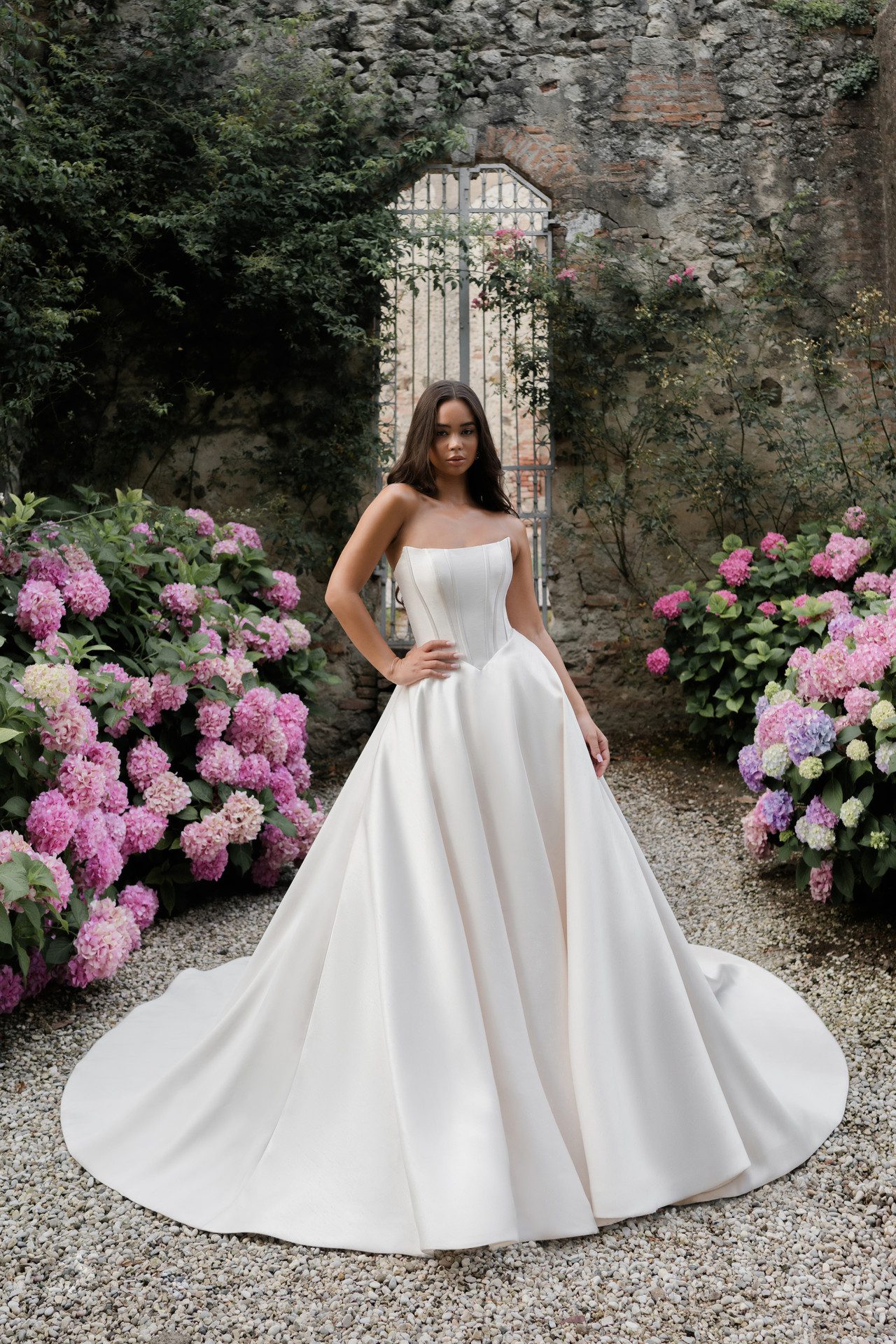 Luminous pearl shantung composes the refined A-line Flora gown, with its strapless peaked neckline and boned basque bodice.
