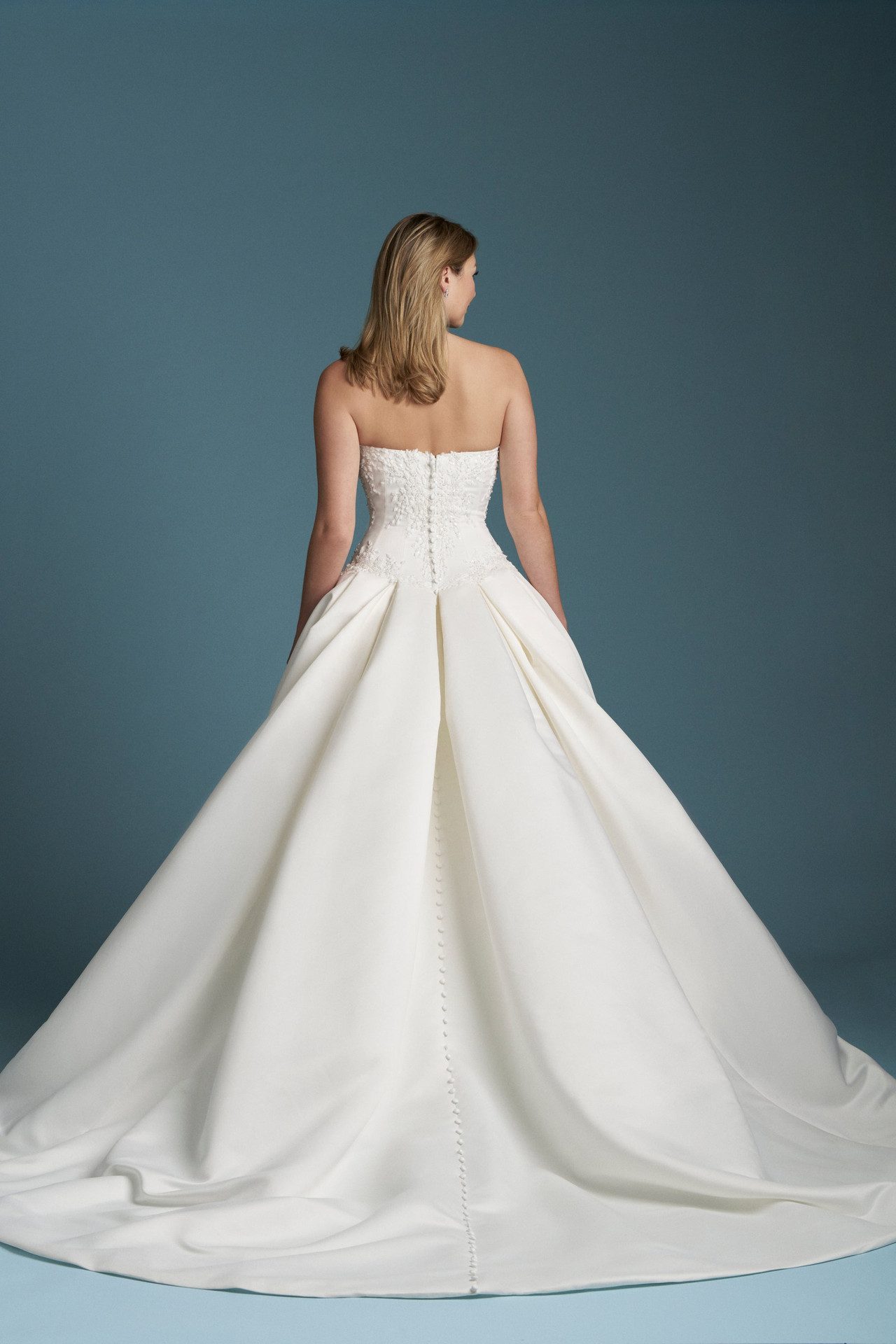 Softly lustrous satin and tonal beading bring quiet dimension to the bodice of this drop waist ballgown, framing a scoop neckline with subtle structure. The silhouette feels timeless yet elevated, offering a modern interpretation of a classic bridal silhouette.
