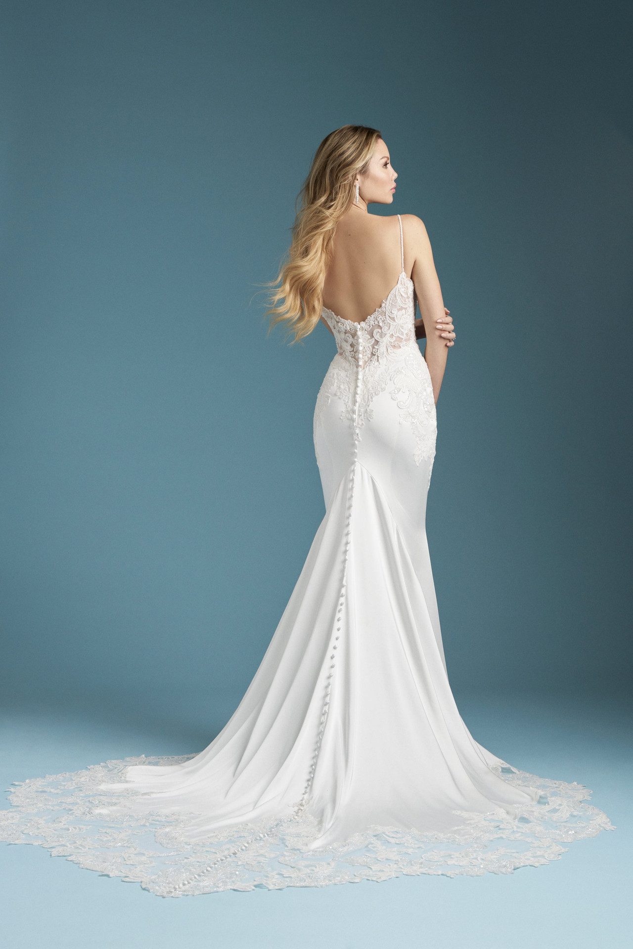 This sleek sheath gown features a sheer beaded lace bodice with a deep V-neckline and delicate spaghetti straps. A soft basque waistline gently defines the figure, flowing into a stretch satin skirt that hugs every curve with understated elegance.
