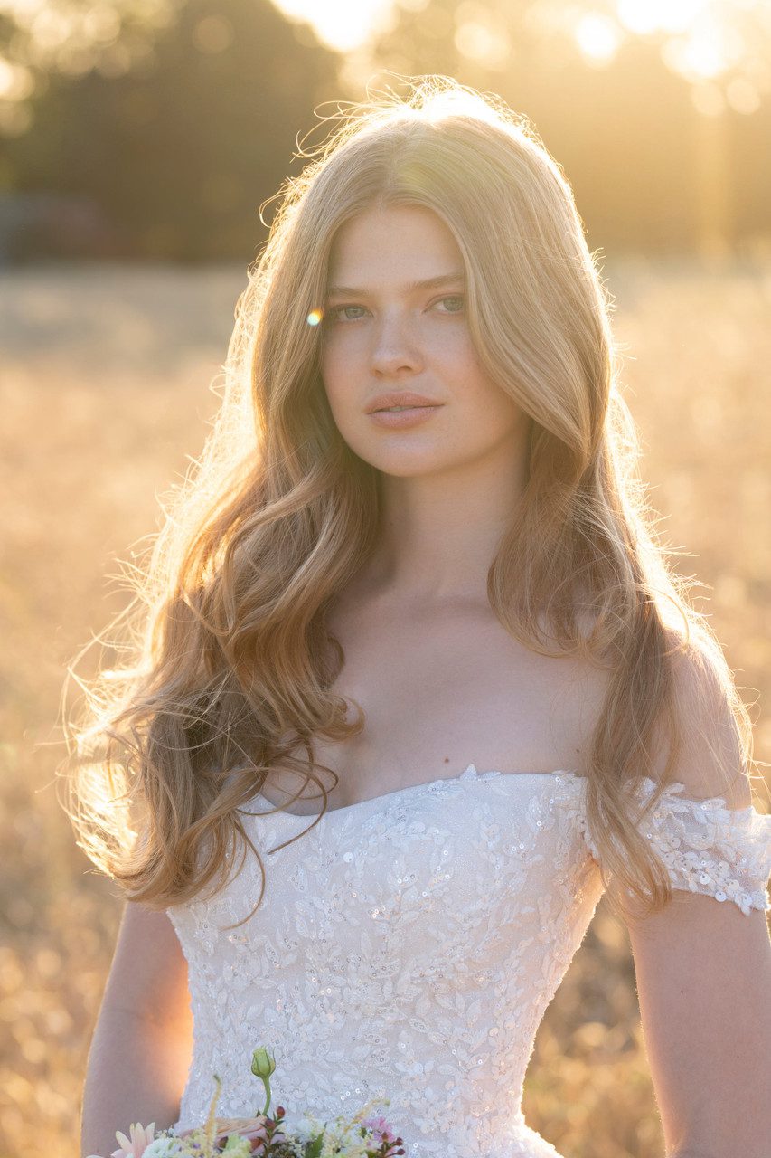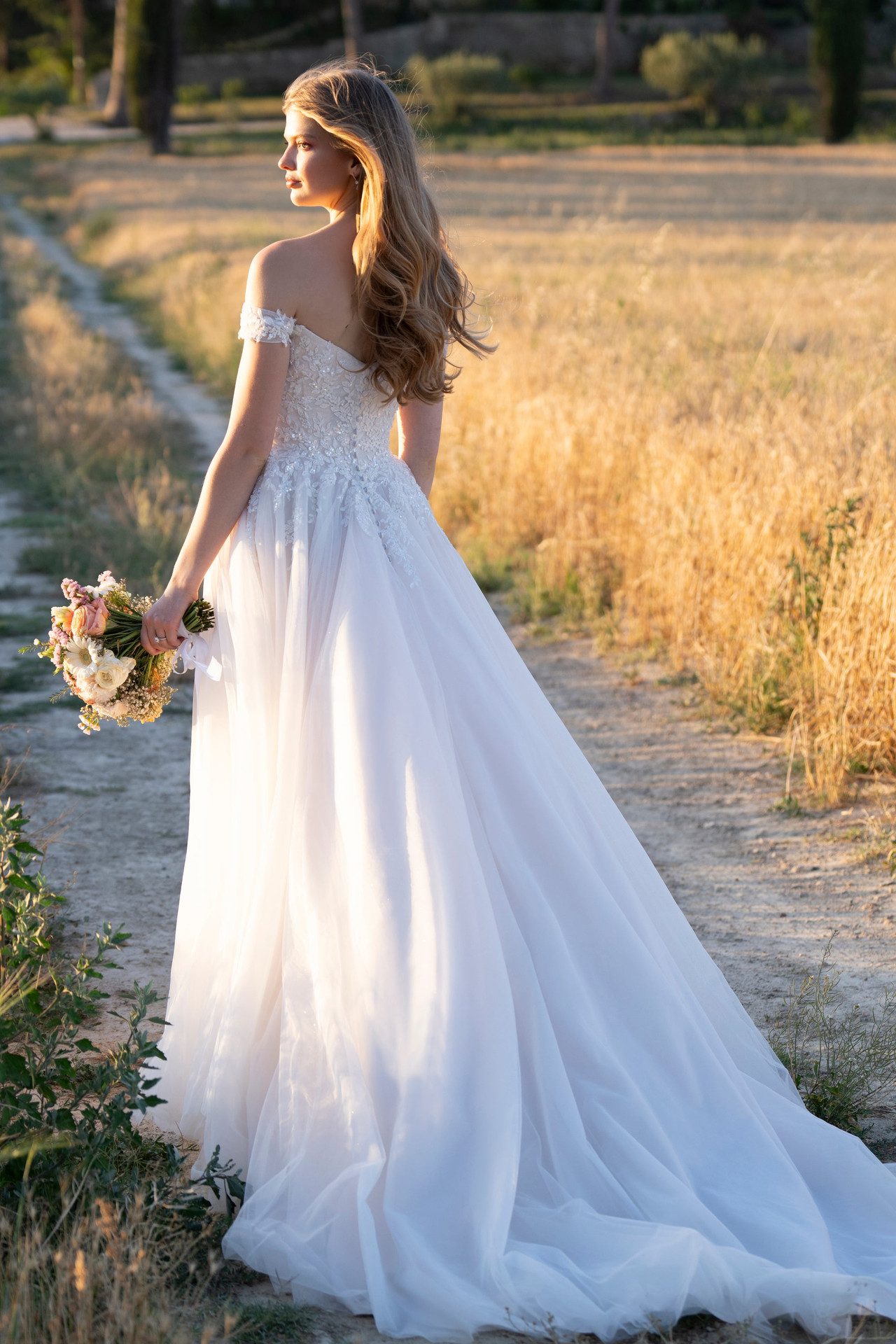 This off-shoulder tulle ballgown features sequined and beaded lace appliques.