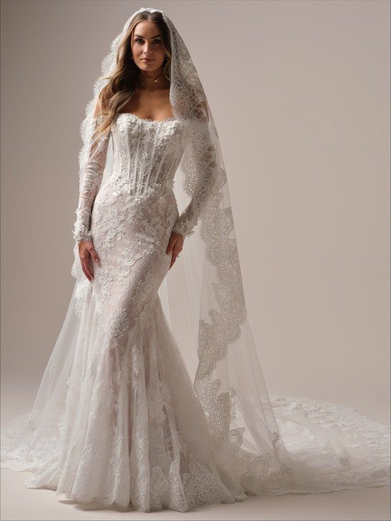 Customize your look with optional add-ons: Detachable Cap Sleeves, Cathedral Veil
