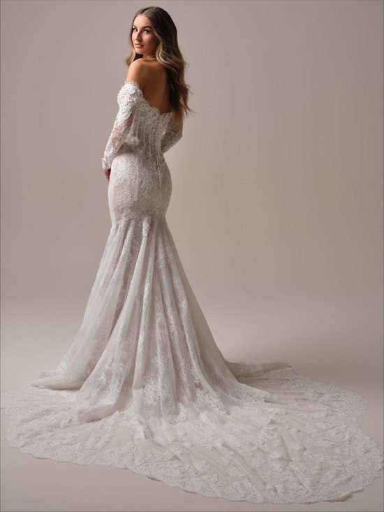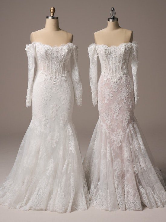 Featuring lush illusion, bloom-like motifs, and boudoir-inspired embellishments, this 3-D floral lace mermaid wedding dress is a true show-stopper.