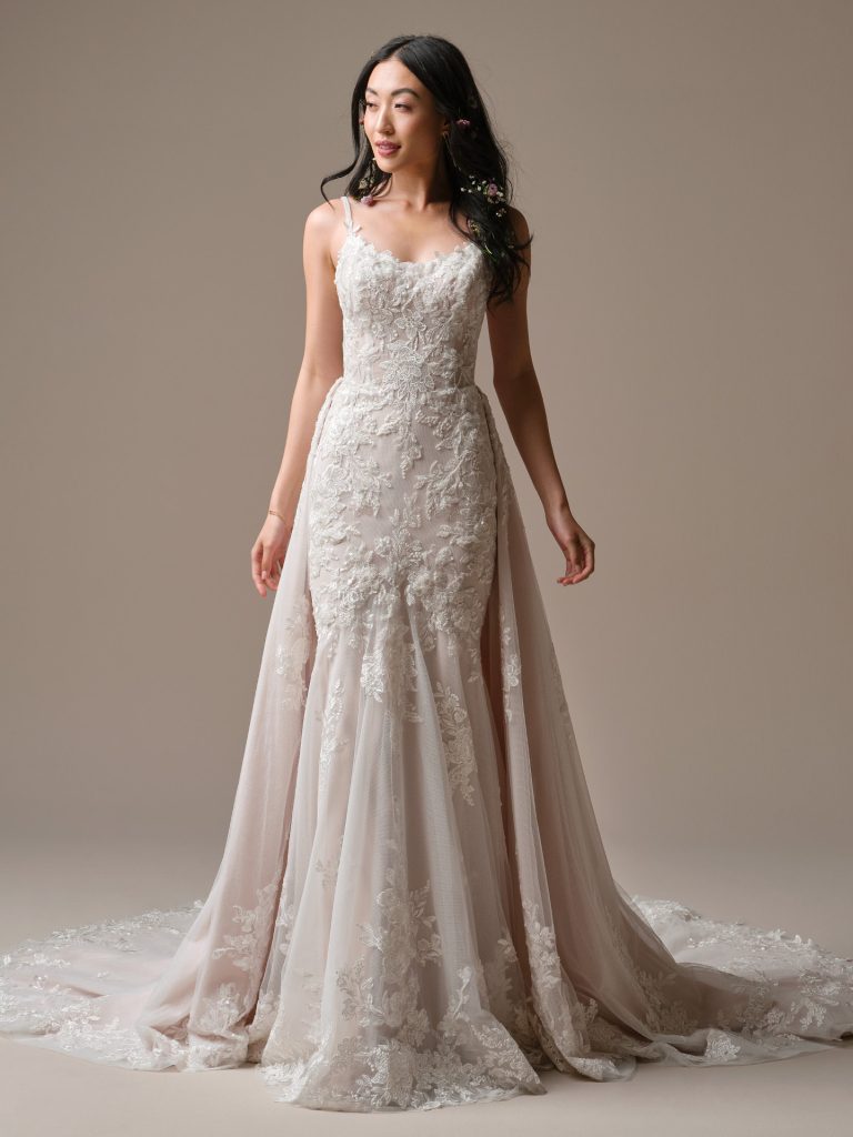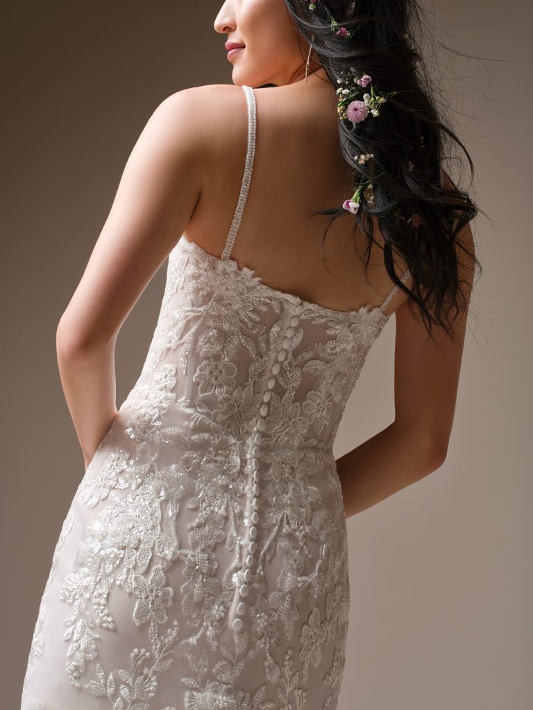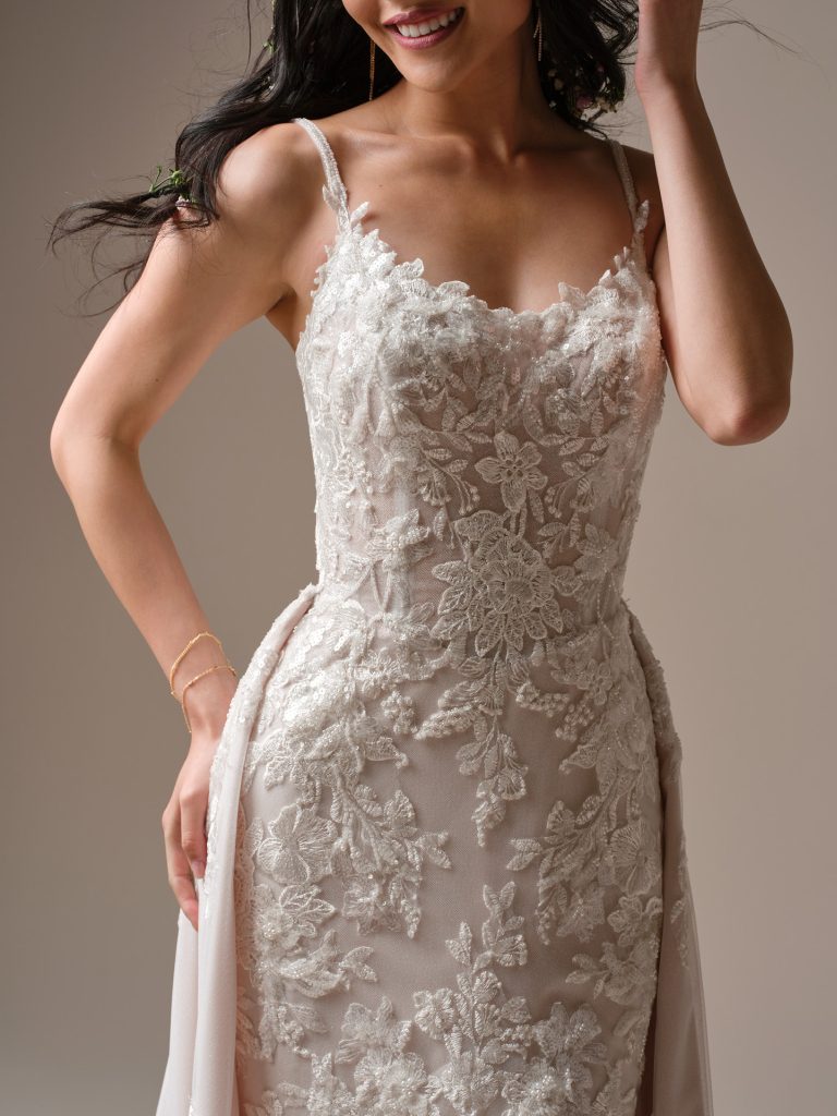 Little things – spaghetti straps, a soft silhouette, and shimmery flourishes – come together for an exquisite statement in this scoop neckline illusion lace bodice wedding dress designed for breezy celebrations.