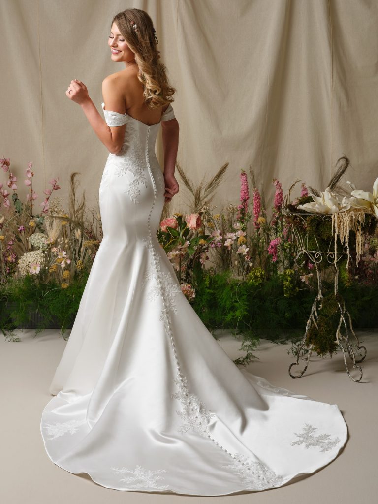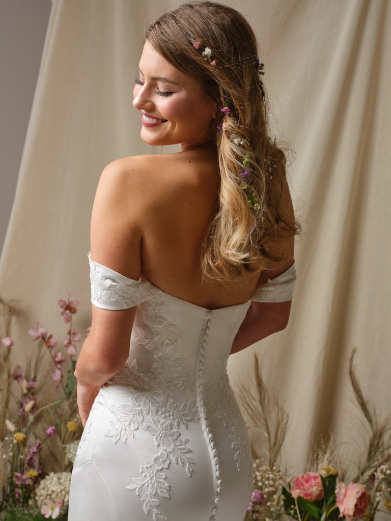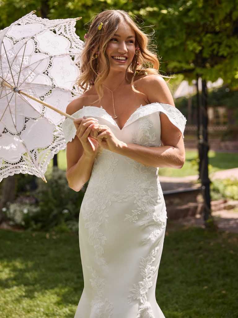 Flattering off-the-shoulder sequined lace accents fit-and-flare wedding dress