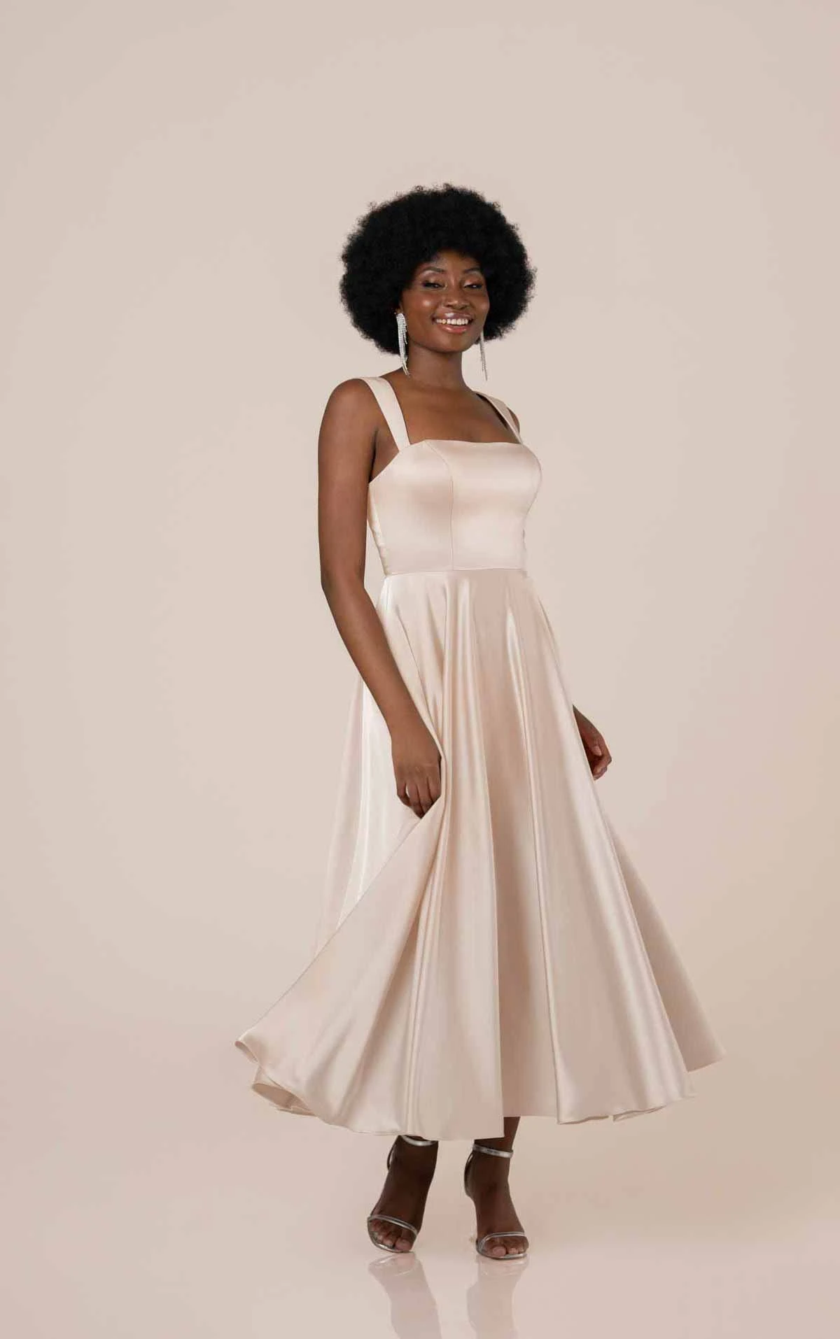 Charmeuse A-line tea-length bridesmaid gown with square neckline.