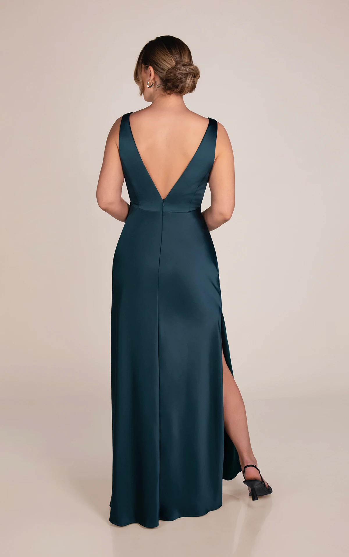 Sleek charmeuse column bridesmaid dress with deep V-neckline and leg slit