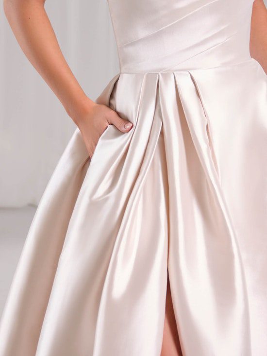 Here’s what we know about this couture strapless A-line wedding dress. 1) Minimalism is powerful. 2) Satin is undeniably timeless.