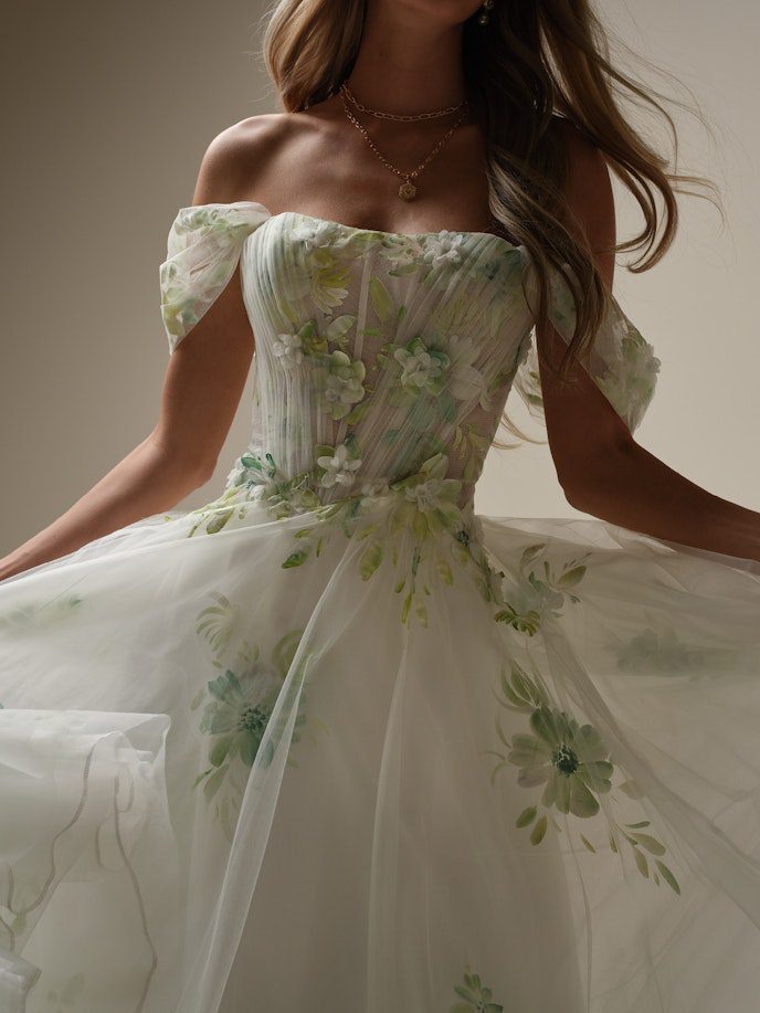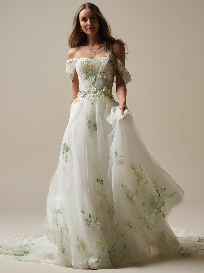 Free-spirited style starts with an ethereal silhouette and luxe fabric. This hand-painted floral A-line bridal gown has both those bases covered – and more.